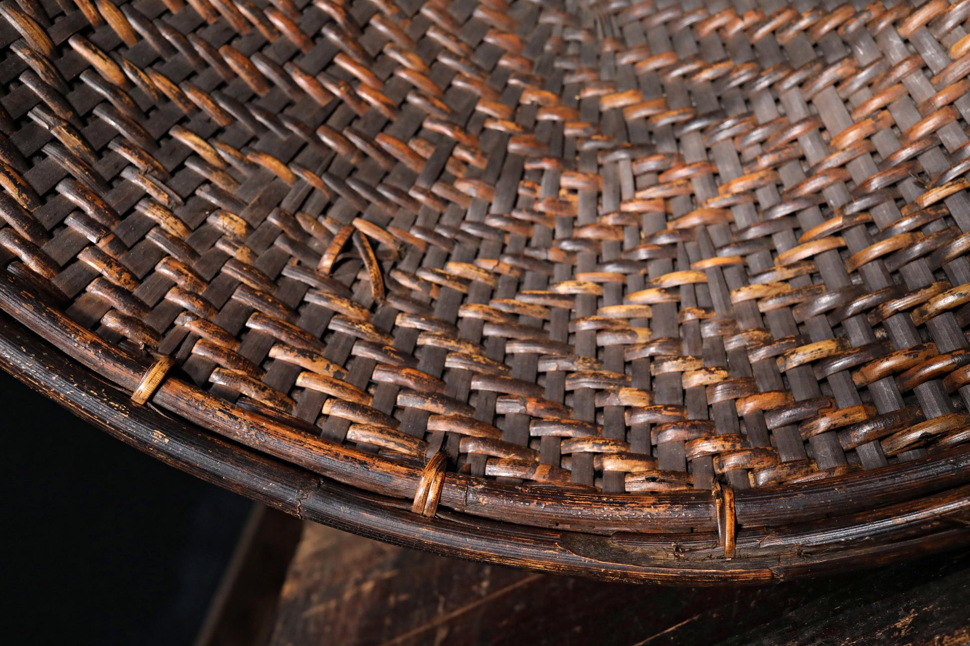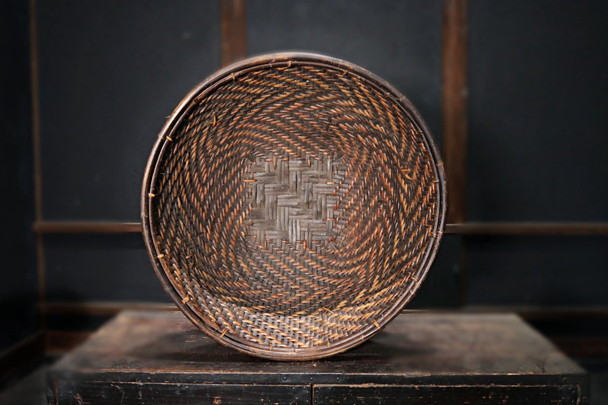 RARE! LARGE! Antique Japanese Farmers Hand Woven Wild grape vine Round Basket, Ajiro ami, MINGEI hand craft, H8.8xW22in/22.4x56cm