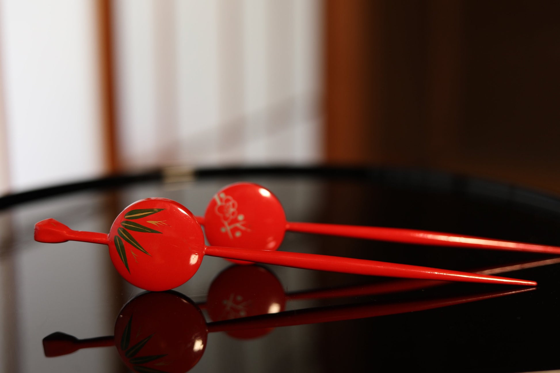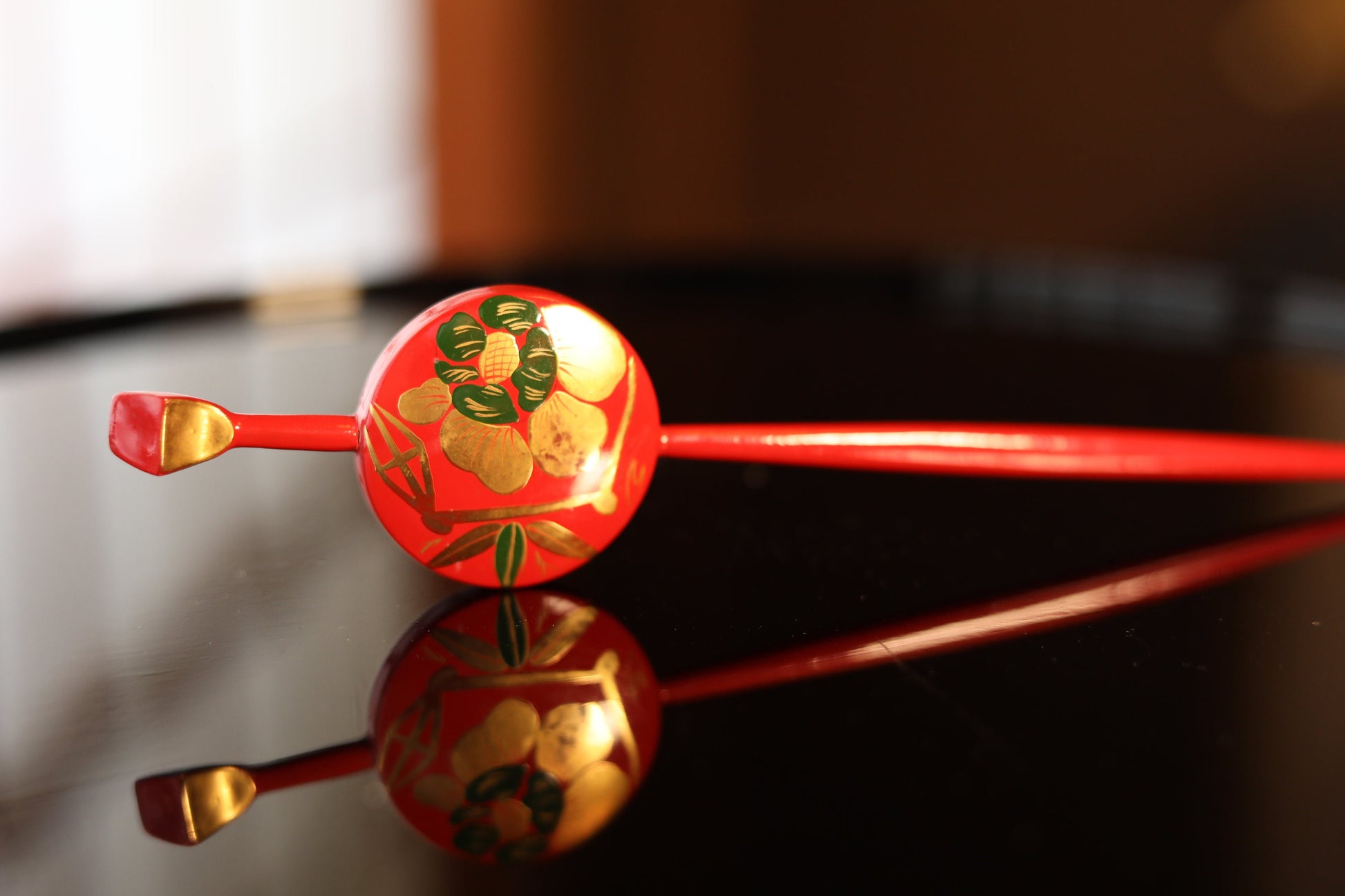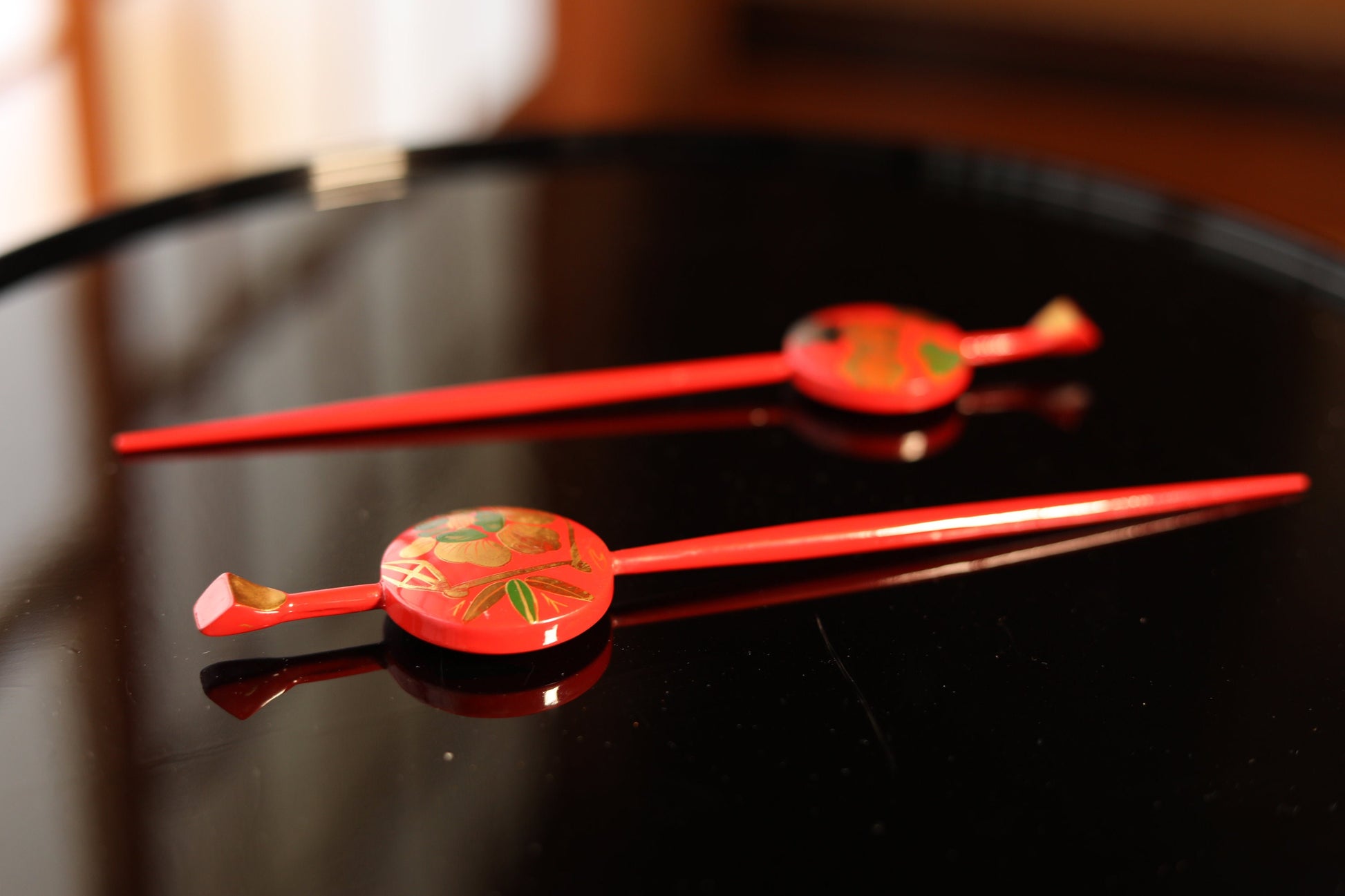 Red Gold KIMONO accessories made of wood & lacquer ,Japanese Antique Floral Plant pattern "Kanzashi"Hairpin hatpin pair set