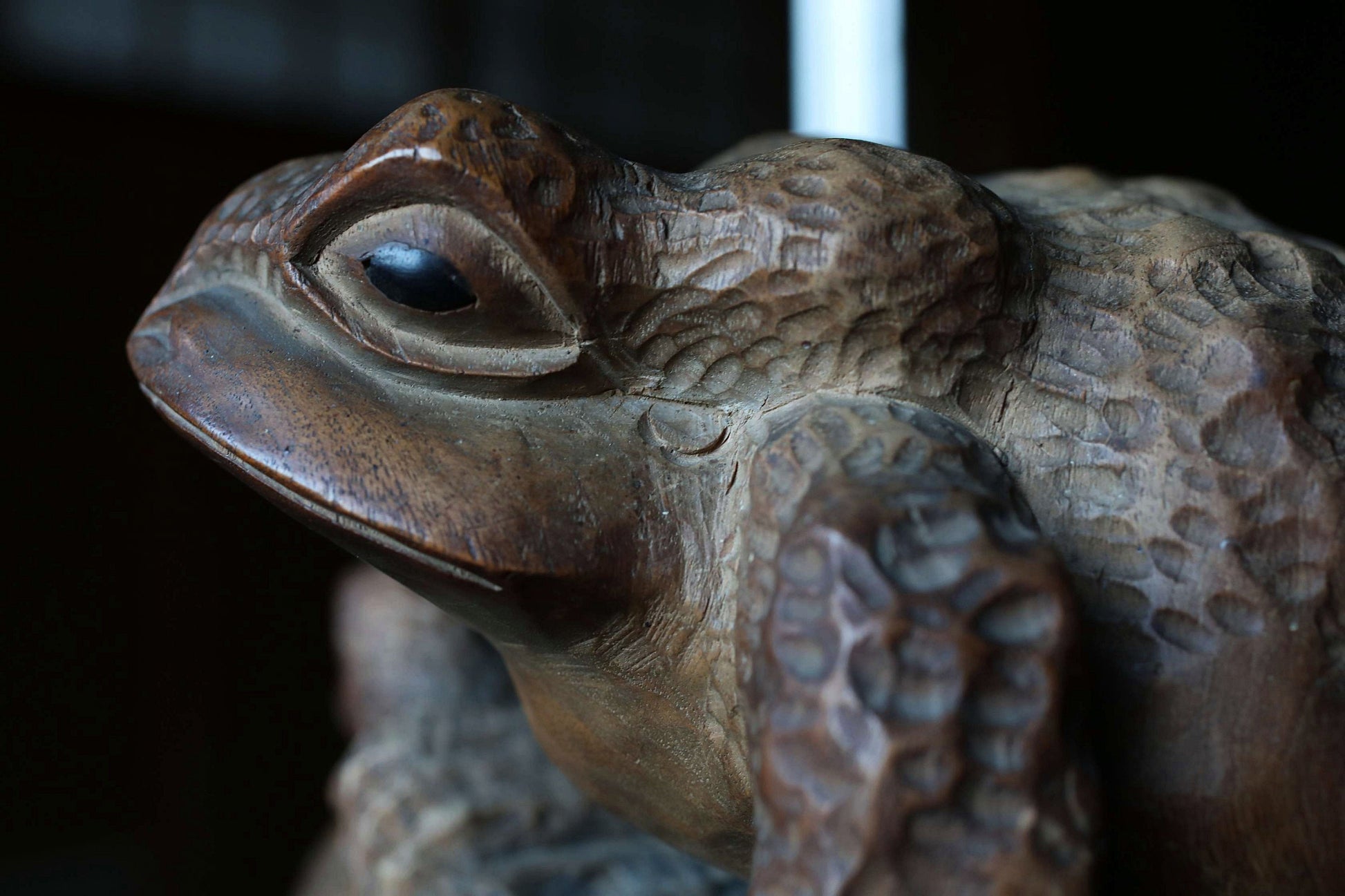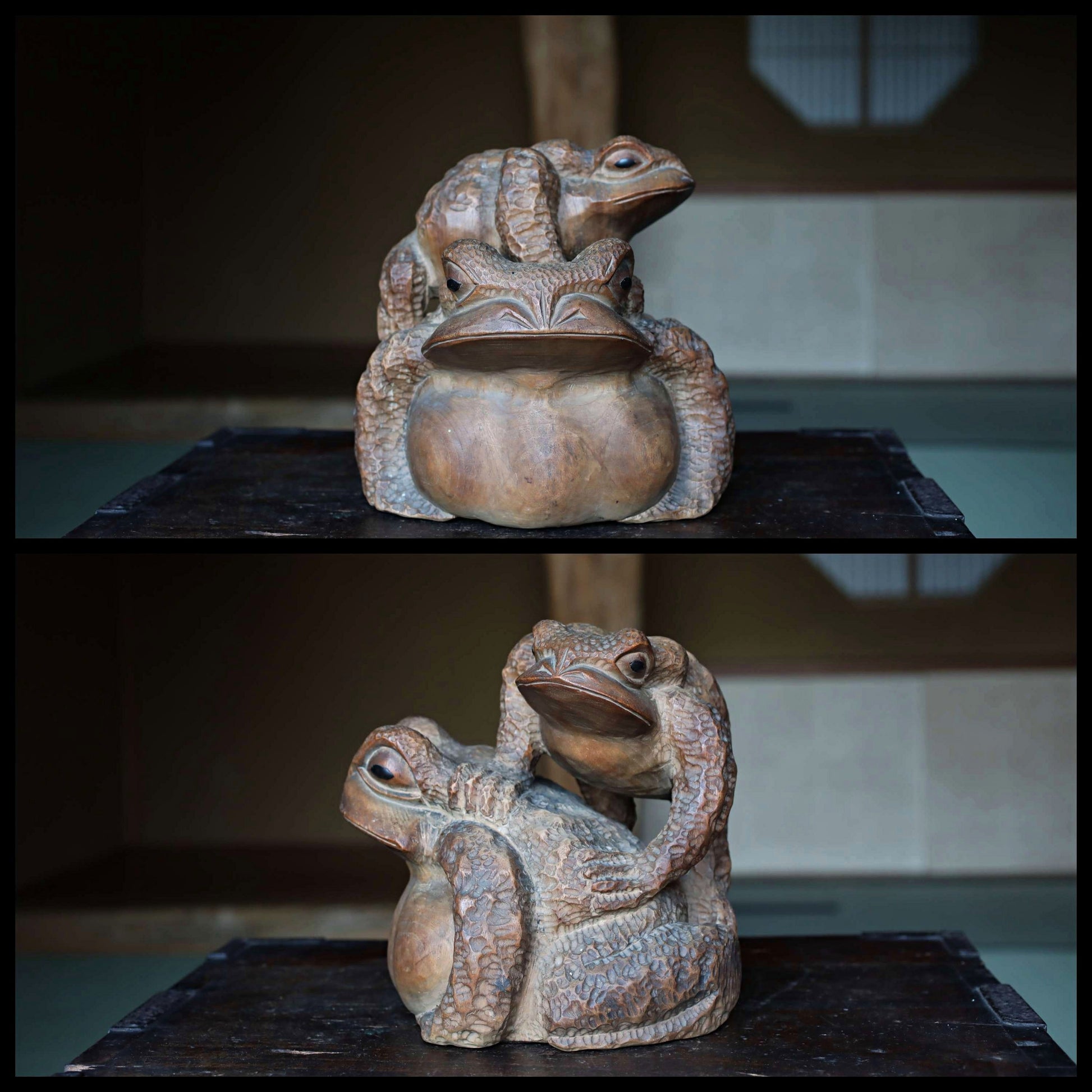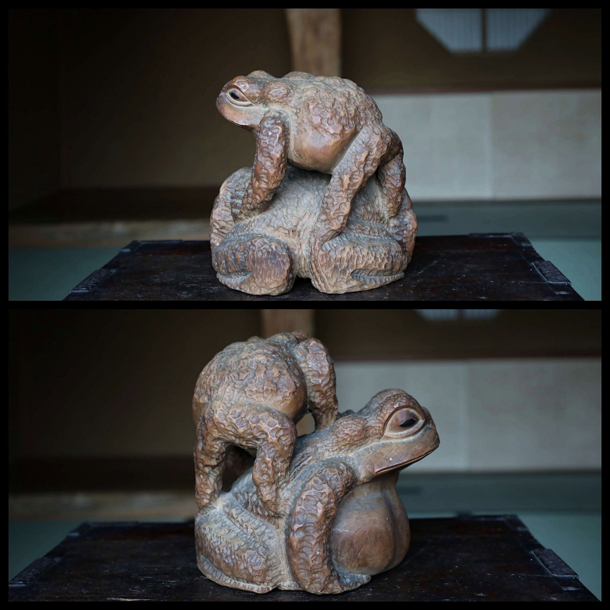 Rural Japanese vintage wooden Kaeru frog sculpture, Kibori art craft hand carving sculpture ,wood animal doll 1960s H8.3×8.7in/H21×22cm.