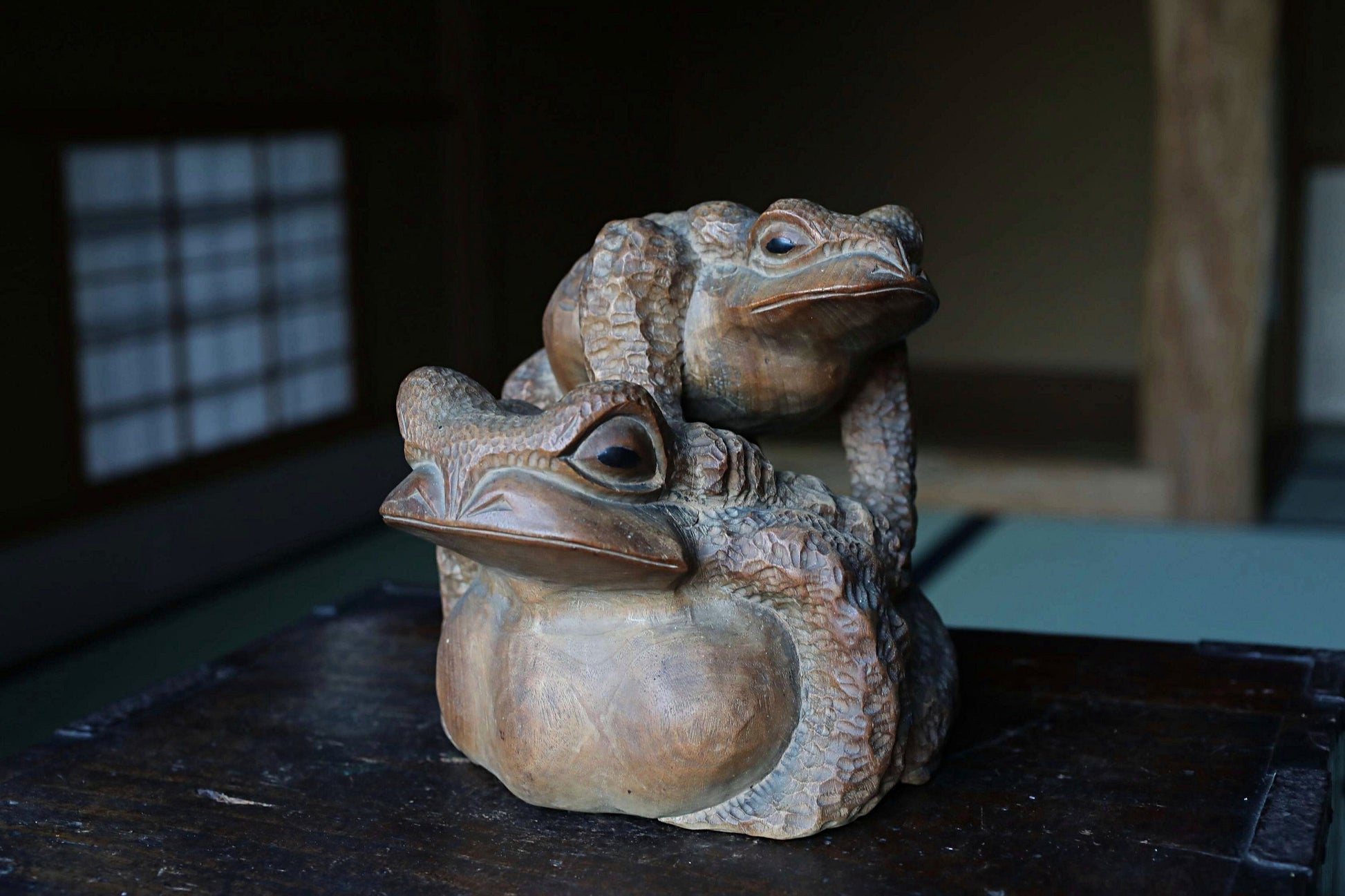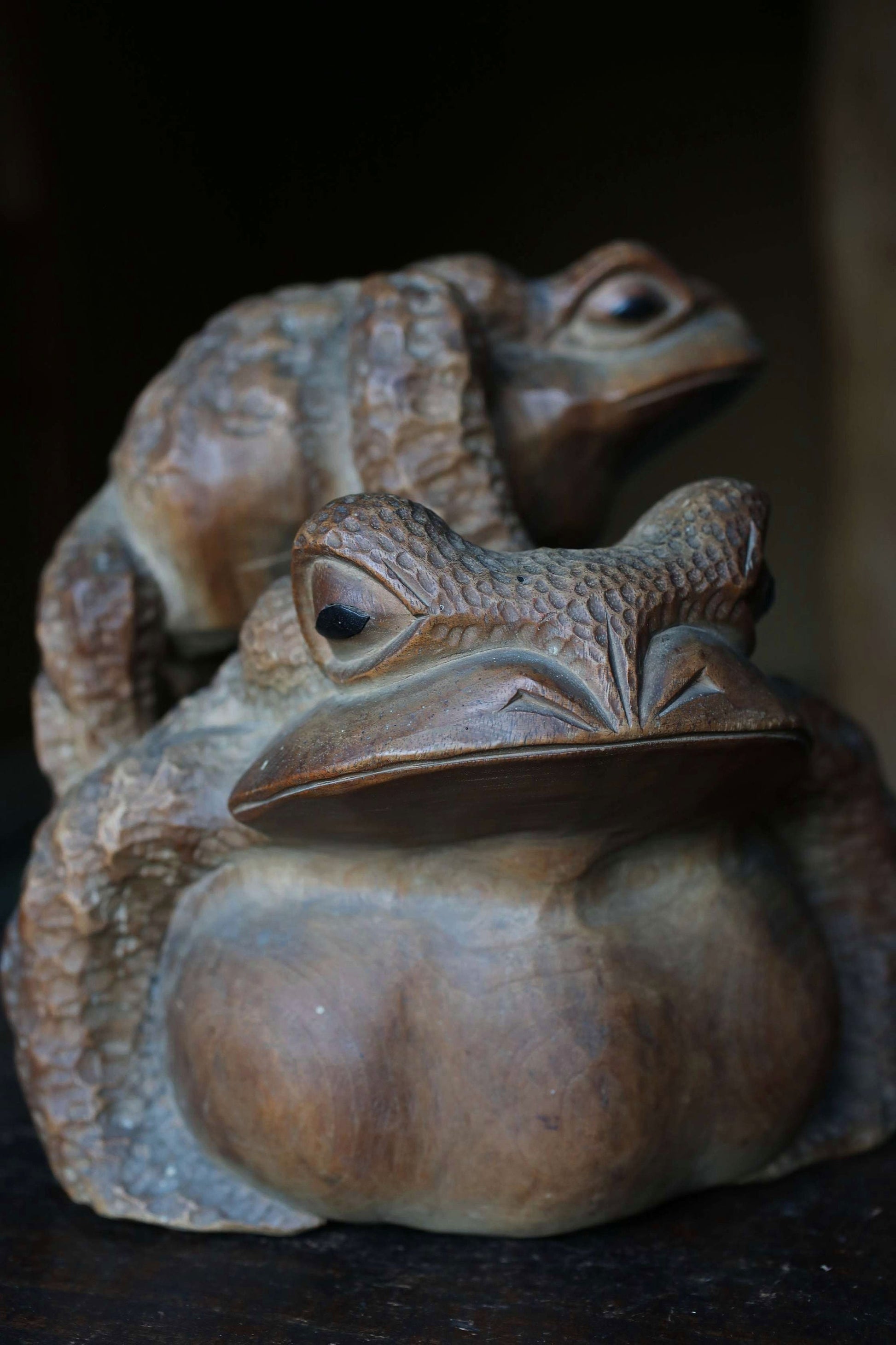 Rural Japanese vintage wooden Kaeru frog sculpture, Kibori art craft hand carving sculpture ,wood animal doll 1960s H8.3×8.7in/H21×22cm
