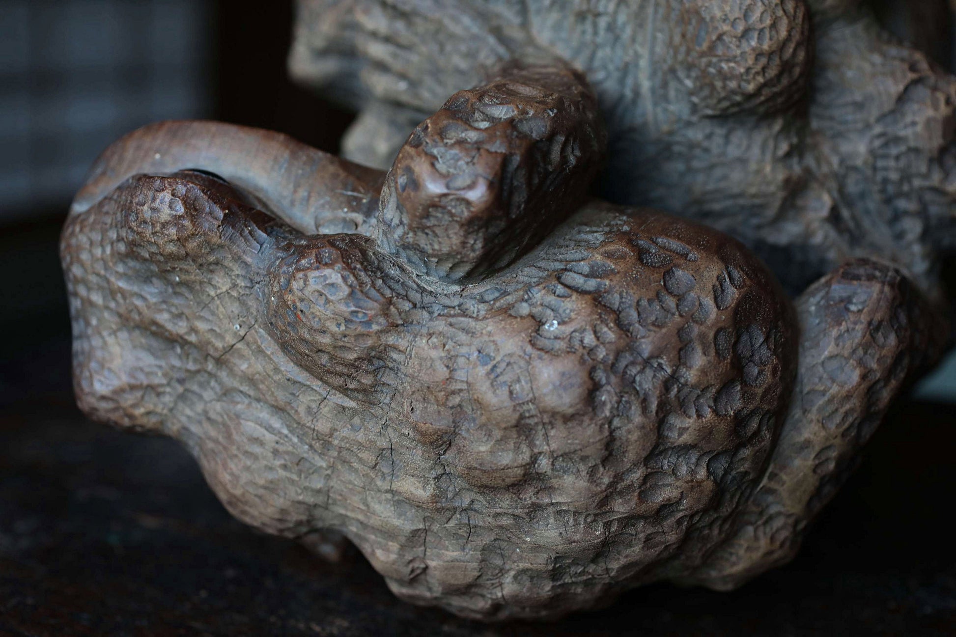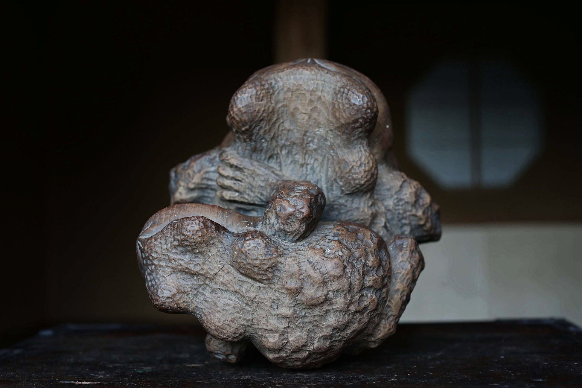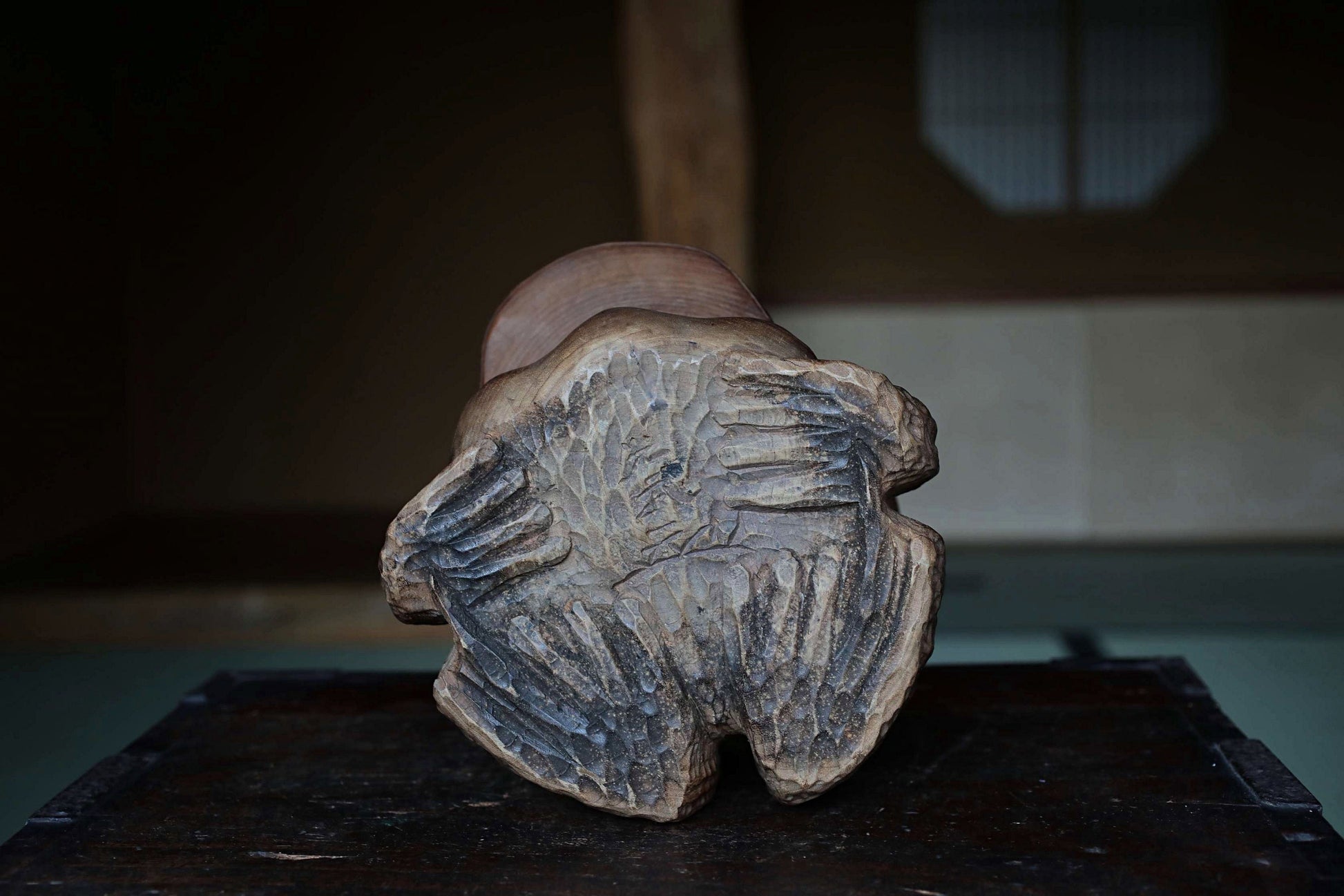 This item was carved as a hobby of a rural woodcutter. The powerful and realistic chisel marks are very impressive.