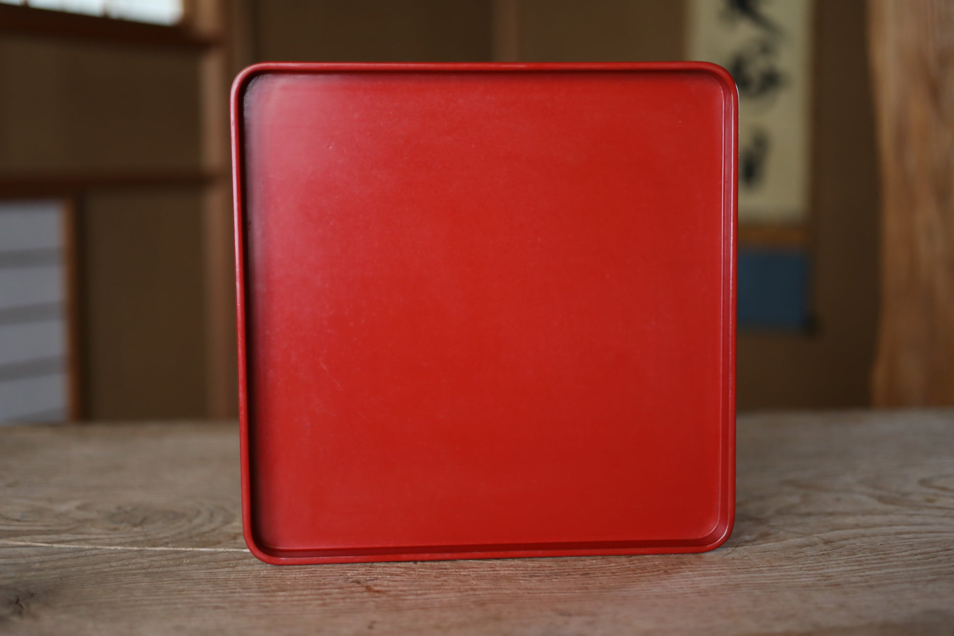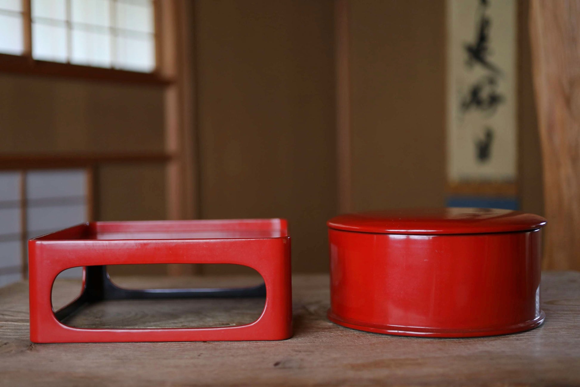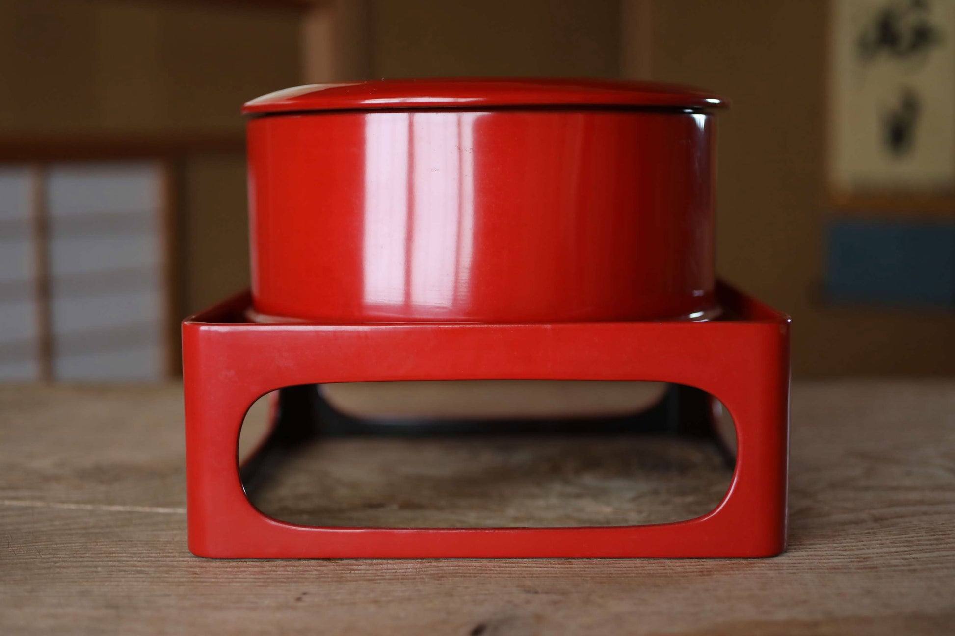 This is a set of a wooden rice storage box with red lacquer finish and its stand, made during the Taisho era. In Japan, rice cooked in traditional kilns was transferred to containers like this for storage. This is called an “お櫃 ohitsu.”