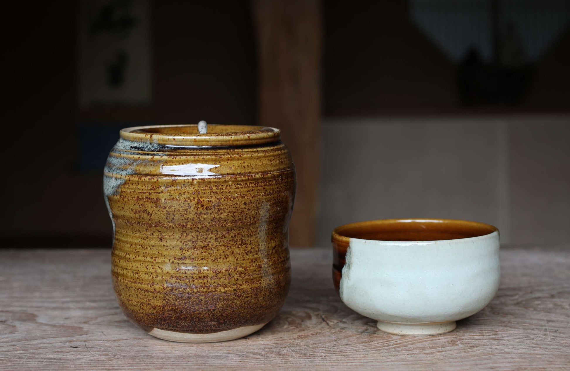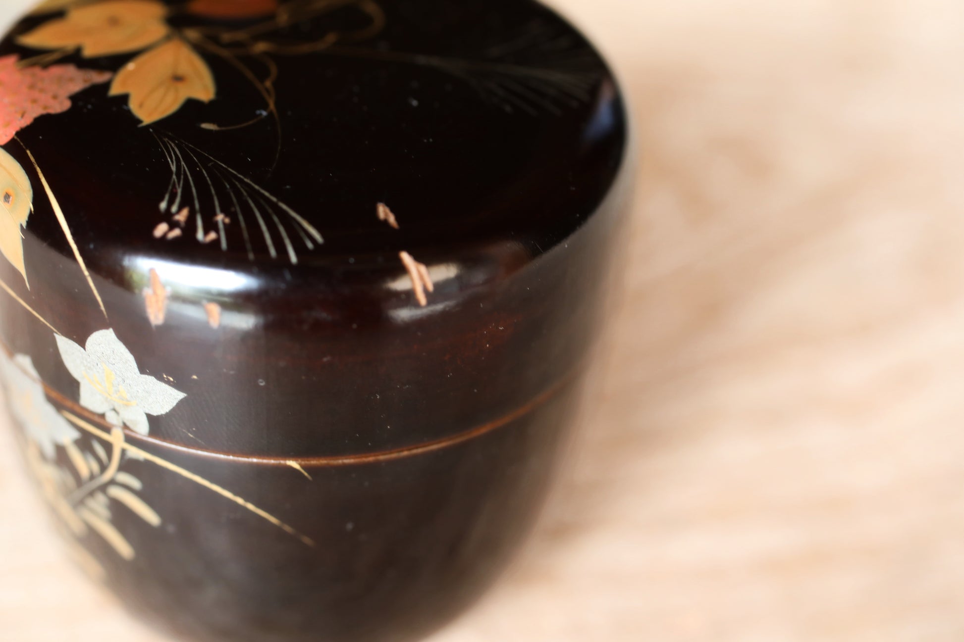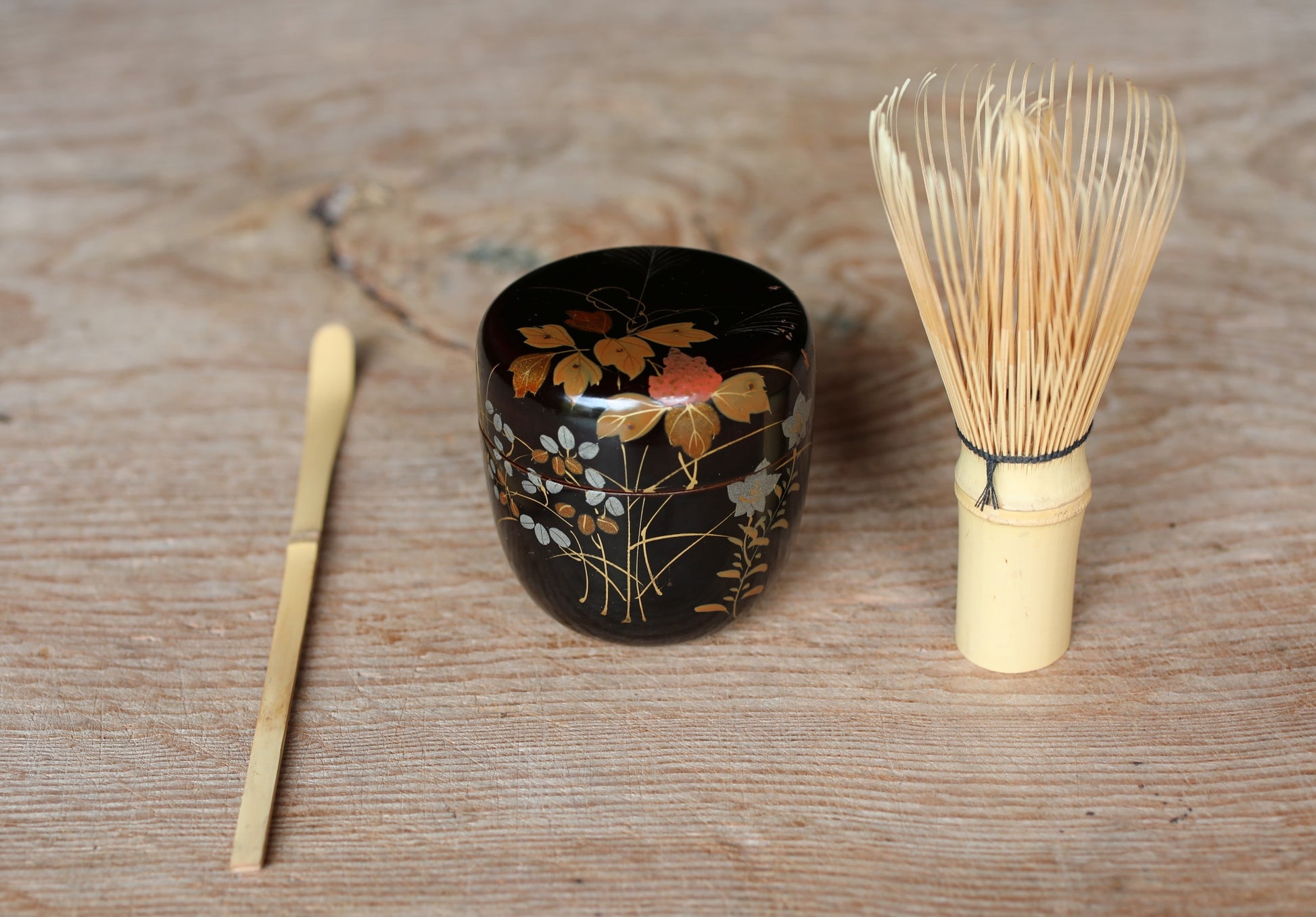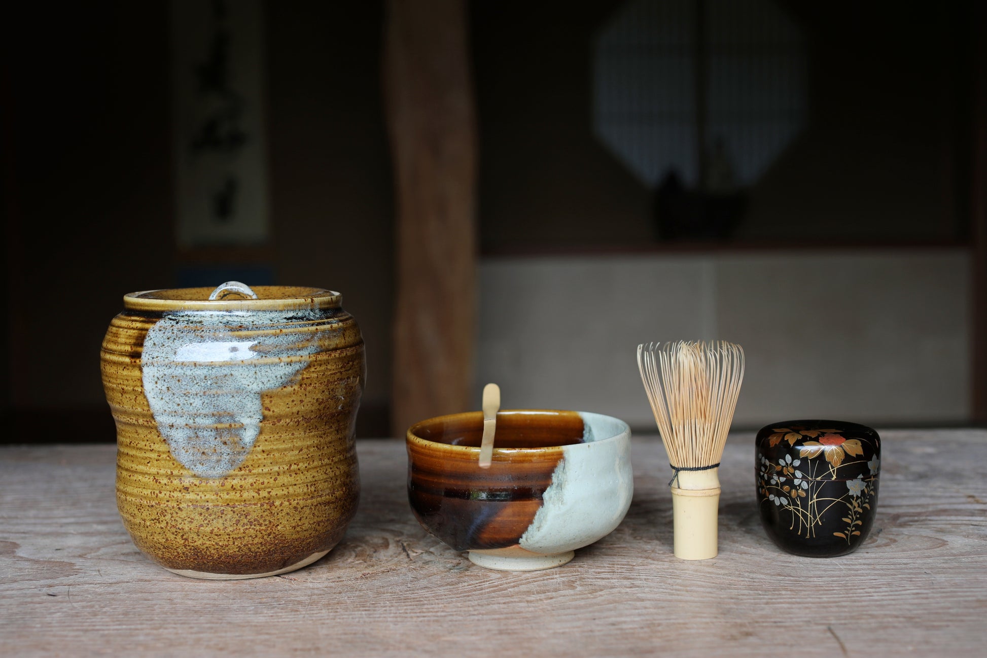 A black lacquered with gold painting tea caddy is the most popular in tea ceremony and works in any season. Water jar from "Seto yaki" kiln is used for rinsing tea bowls, pouring water to a tea kettle to adjust water temperature. Both a tea whisk and tea scoop are made from bamboo.
