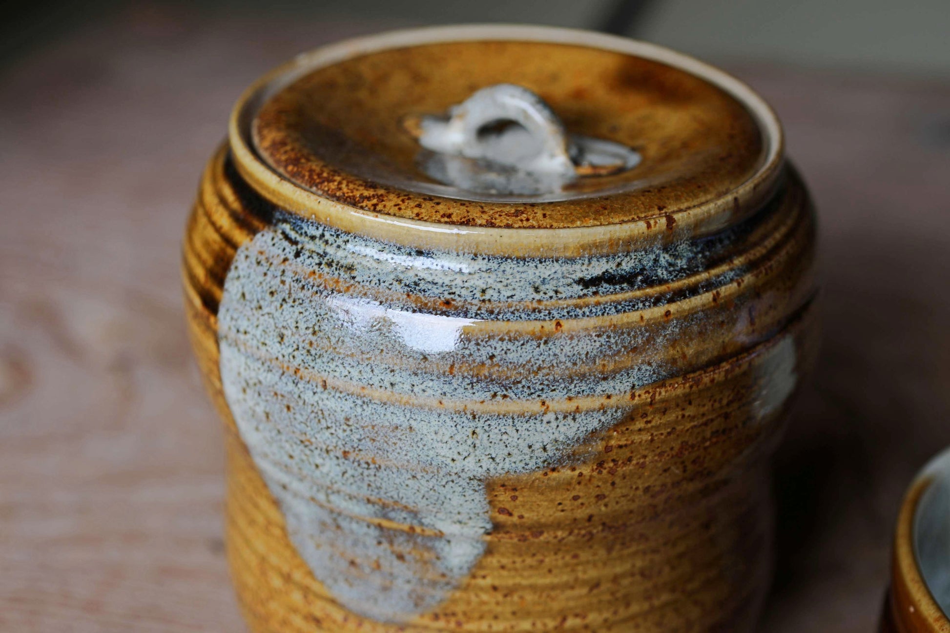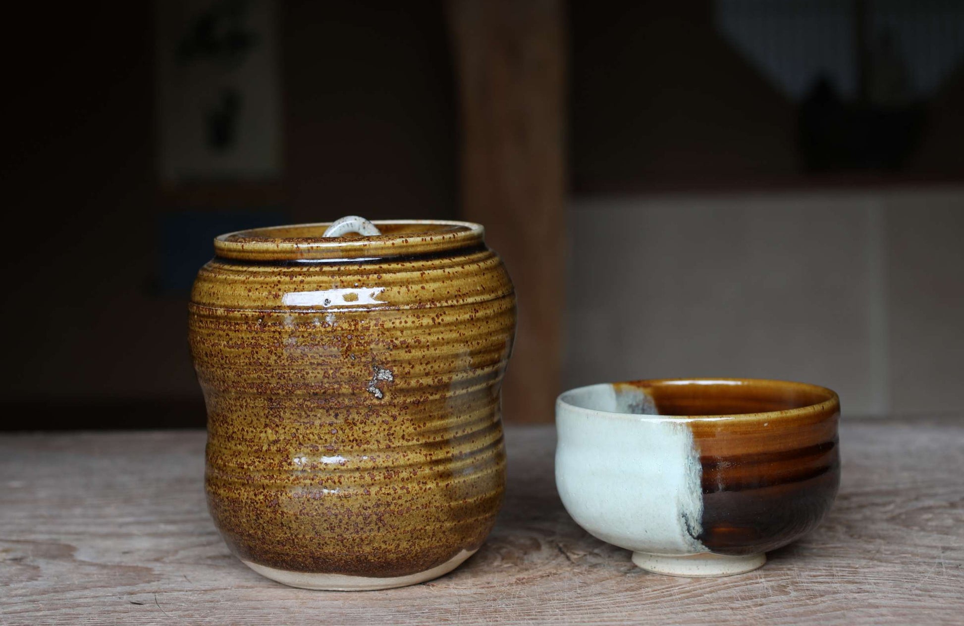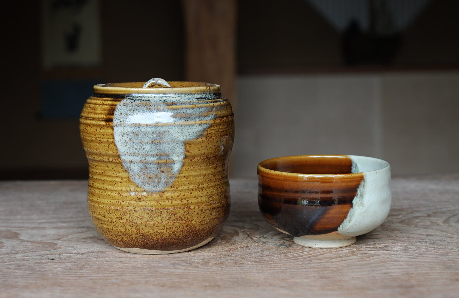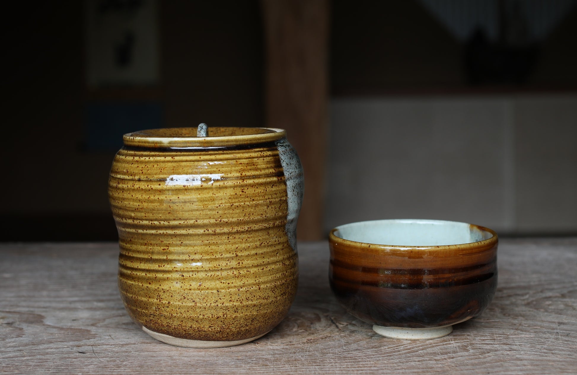A black lacquered with gold painting tea caddy is the most popular in tea ceremony and works in any season. Water jar from "Seto yaki" kiln is used for rinsing tea bowls, pouring water to a tea kettle to adjust water temperature. Both a tea whisk and tea scoop are made from bamboo.