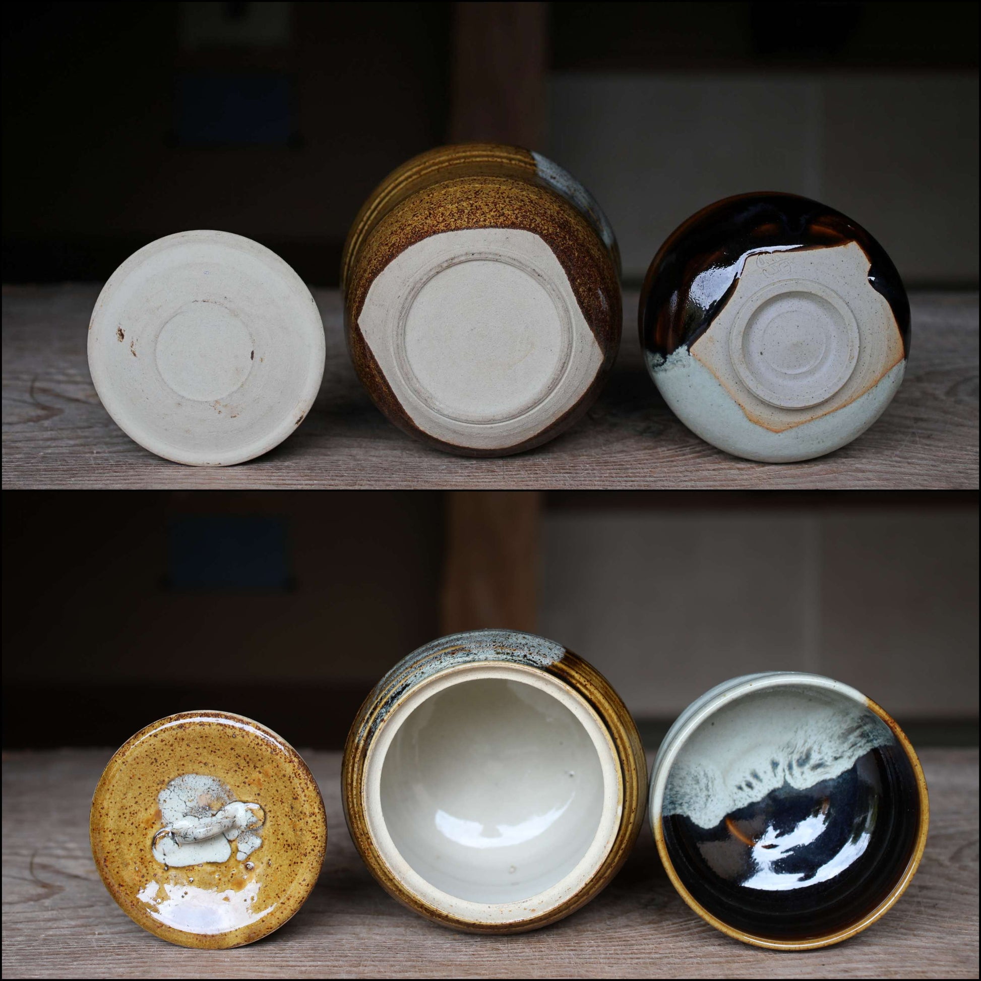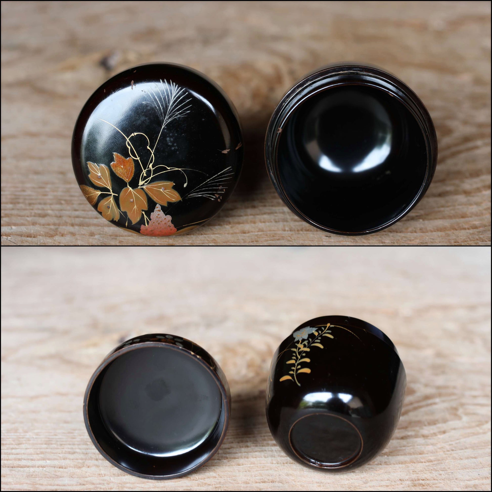 They are in good condition, yet there is a slightly lacquer's peeling off on a tea caddy as shown in a picture.